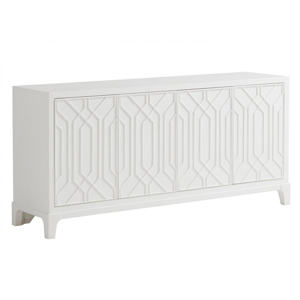 - The Oak Creek buffet, a signture item in the collection, features a transitional geometric fretwork design on the door fronts.