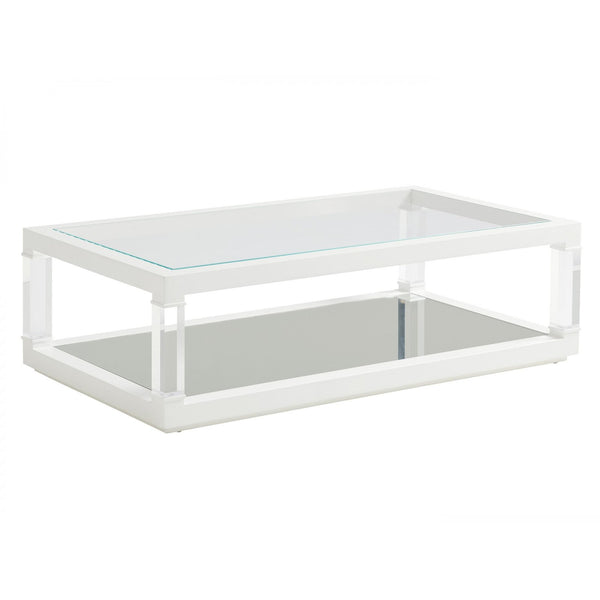 - The fresh transitional design of the Riverdale cocktail table features acrylic posts, an inset glass top and mirrored bottom shelf.