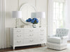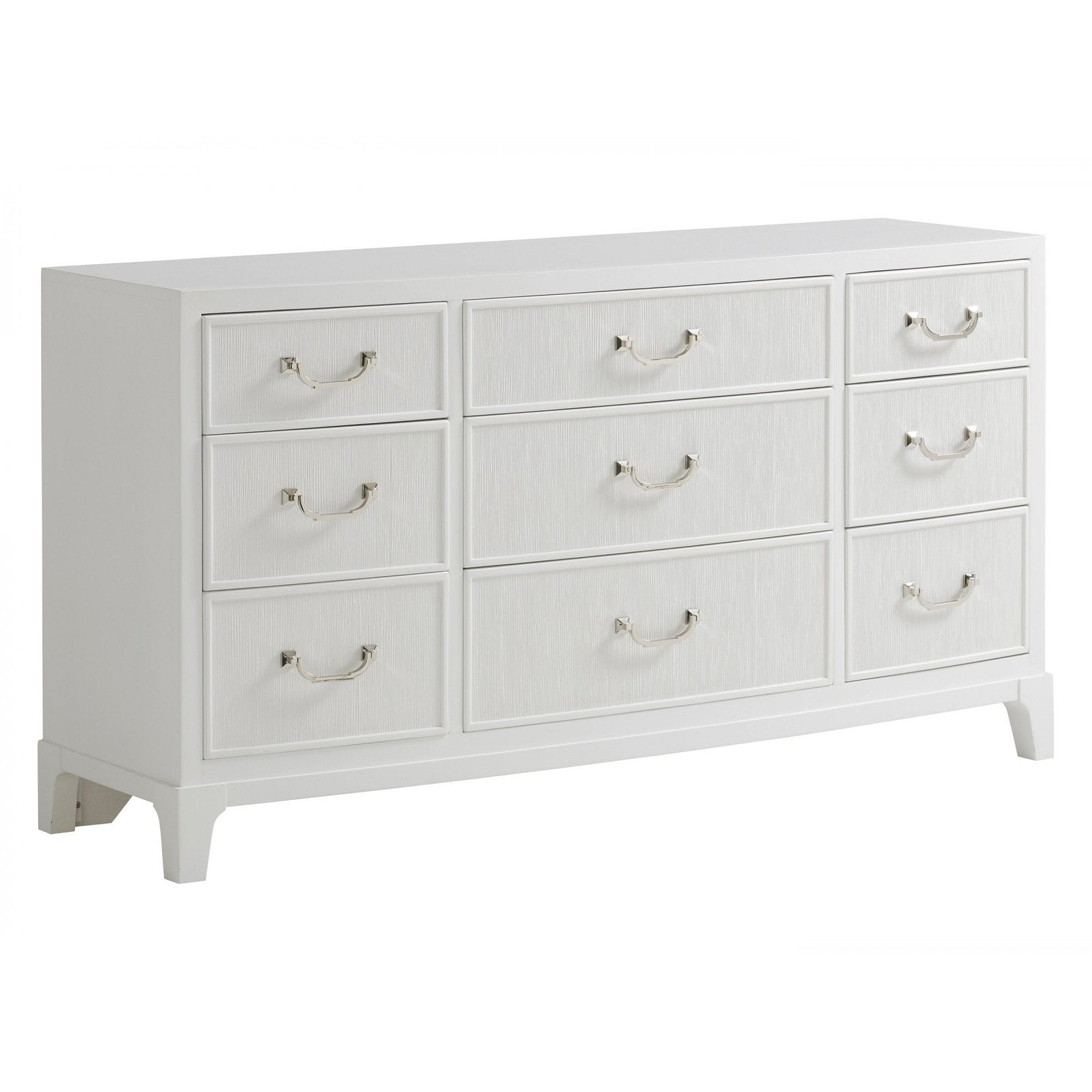 - The Silver Lake triple dresser features a graceful bowfront design, with textured veneer on the framed nine drawer fronts and polished nickel hardware above bracket feet.