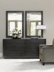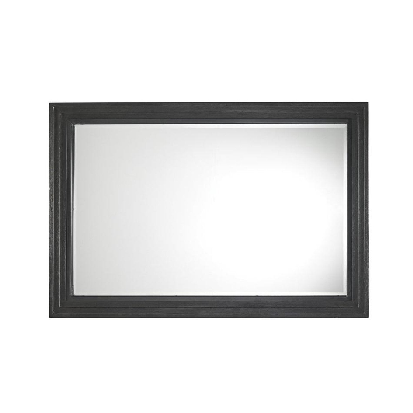 - The versatile Volante mirror features a wood frame with metallic gray metal insert.