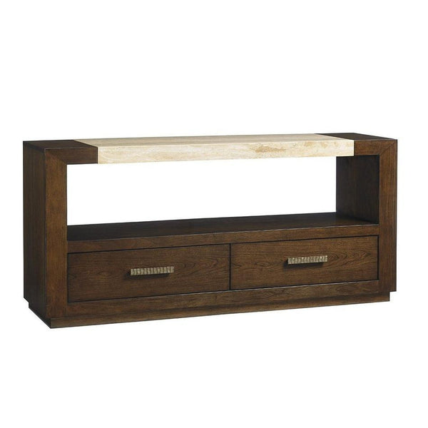 - An inset silver travertine top is artfully suspended above an open compartment and two full extension drawers.