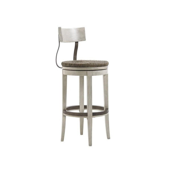 - Casual, yet sophisticated, this swivel barstool features a hand-woven rush seat and shaped metal back support complementing its light oyster shell finish.