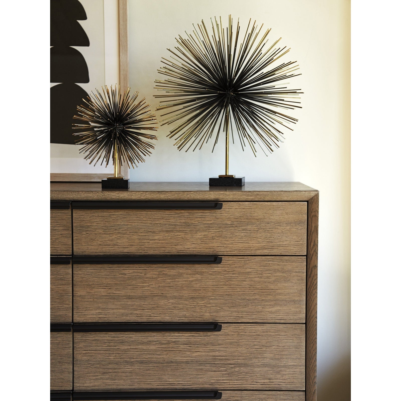 - The custom designed hardware in the dark umber finish is offset on the drawer face while uniting at the horizontal drawer pair.