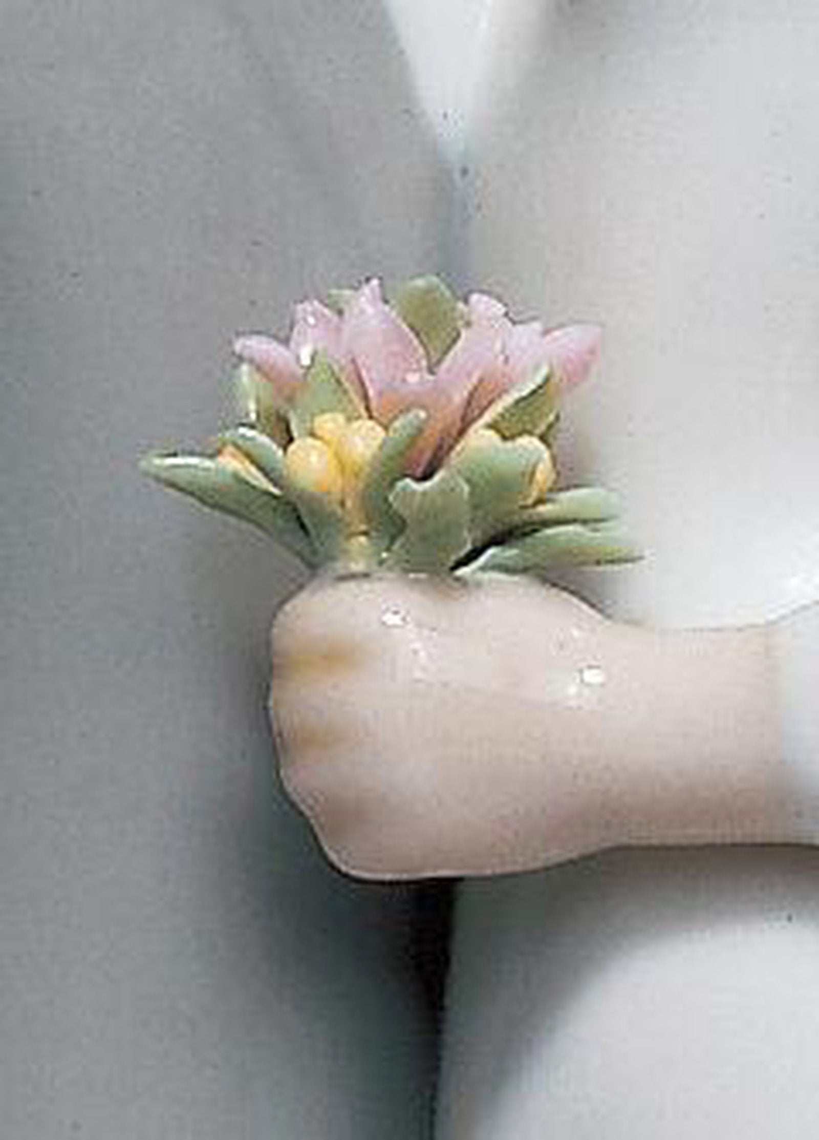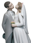 - Glossy porcelain figurine of a kiss from the bride and groom with a small bouquet of flowers and floral ornaments holding the veil.