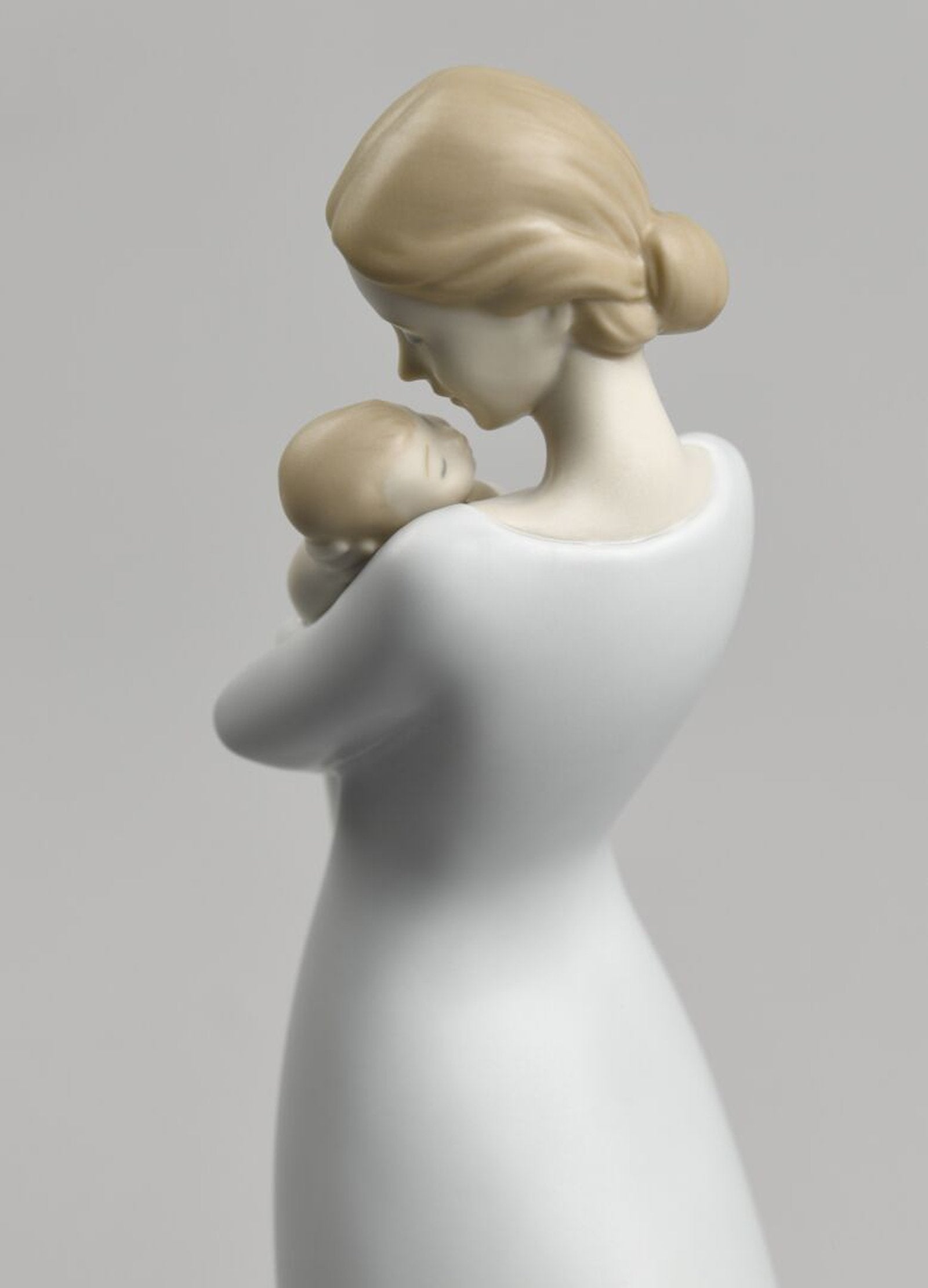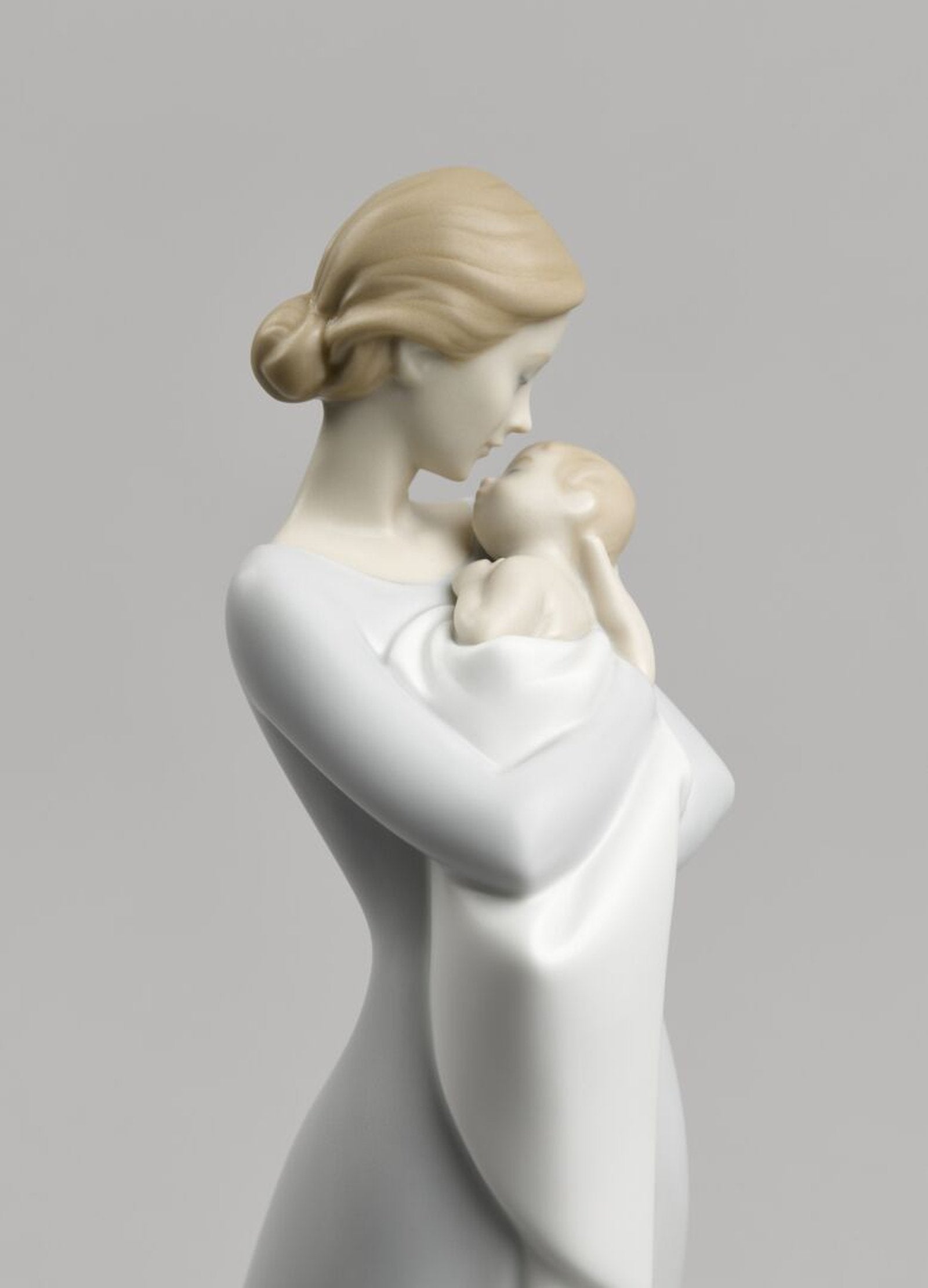 - A young mother is holding her baby in her arms, wrapped in a blanket. The woman's figure is idealized, with synthetic features: her hair tied back, a straight full dress. In turn, it conveys the tenderness of the scene, with the woman's eyes on the baby and a wrapping and embracing posture. Its pure lines and synthetic modeling give this piece a highly distinctive style. The satin-finish matt used ensures a smooth feel which invites one to hold the piece as in an embrace. Also available in a gift set which includes a scented candle (ref. 01017818).