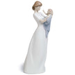 - Porcelain stoneware figurine of a mother in a long, simple white dress with her child in her arms covered in a blue fabric.