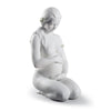 - Matte white porcelain figurine of a pregnant nude woman with floral details adorning her arm and hair.