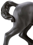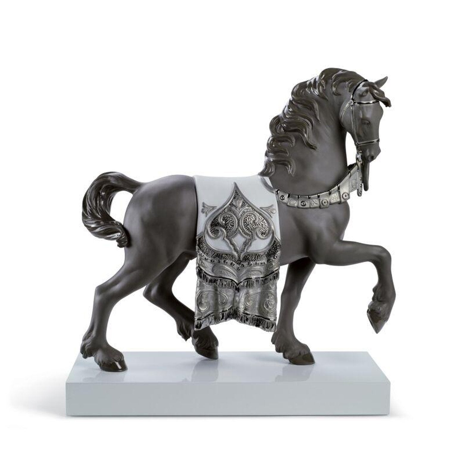 - Courtesan horse sculpture of glossy and matte black porcelain with enamels and silver luster on the arabesques that decorate the harness and blanket.