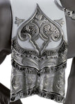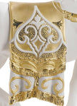 - This elegant horse, lavishly harnessed to carry a lady or mediaeval knight, features an attractive contrast between the white of the horse and the gold of the arabesques that decorate the harness and blanket.