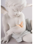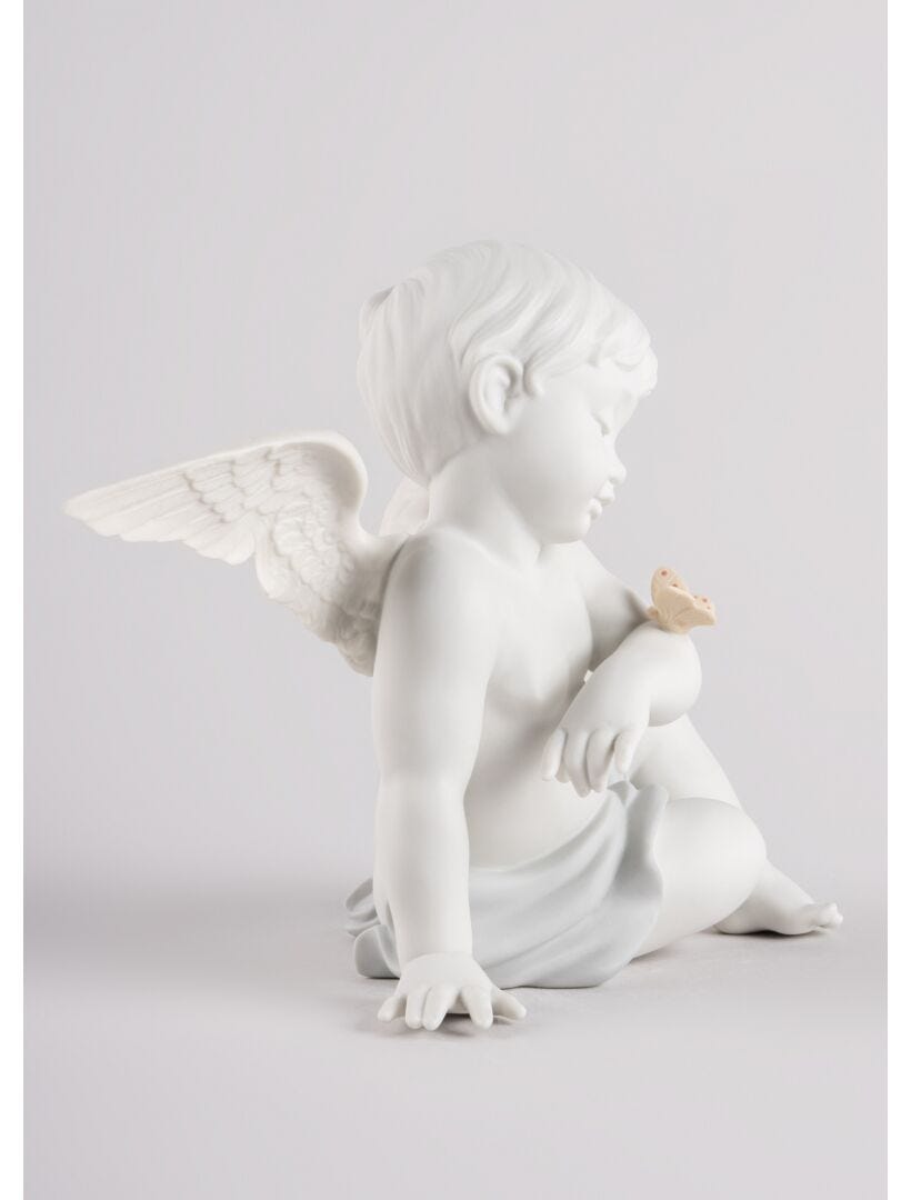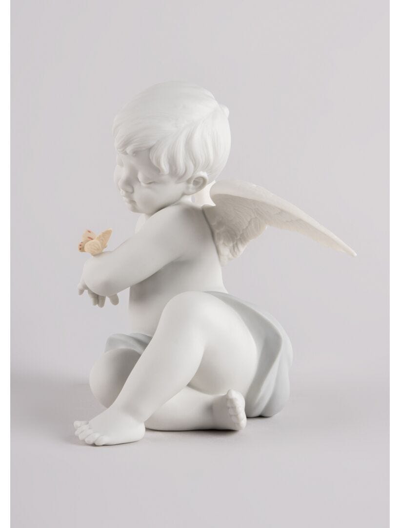 - A cherub, with perfectly executed facial features and exquisitely etched wings, looks in wonder at a cute little butterfly that has landed on his arm.