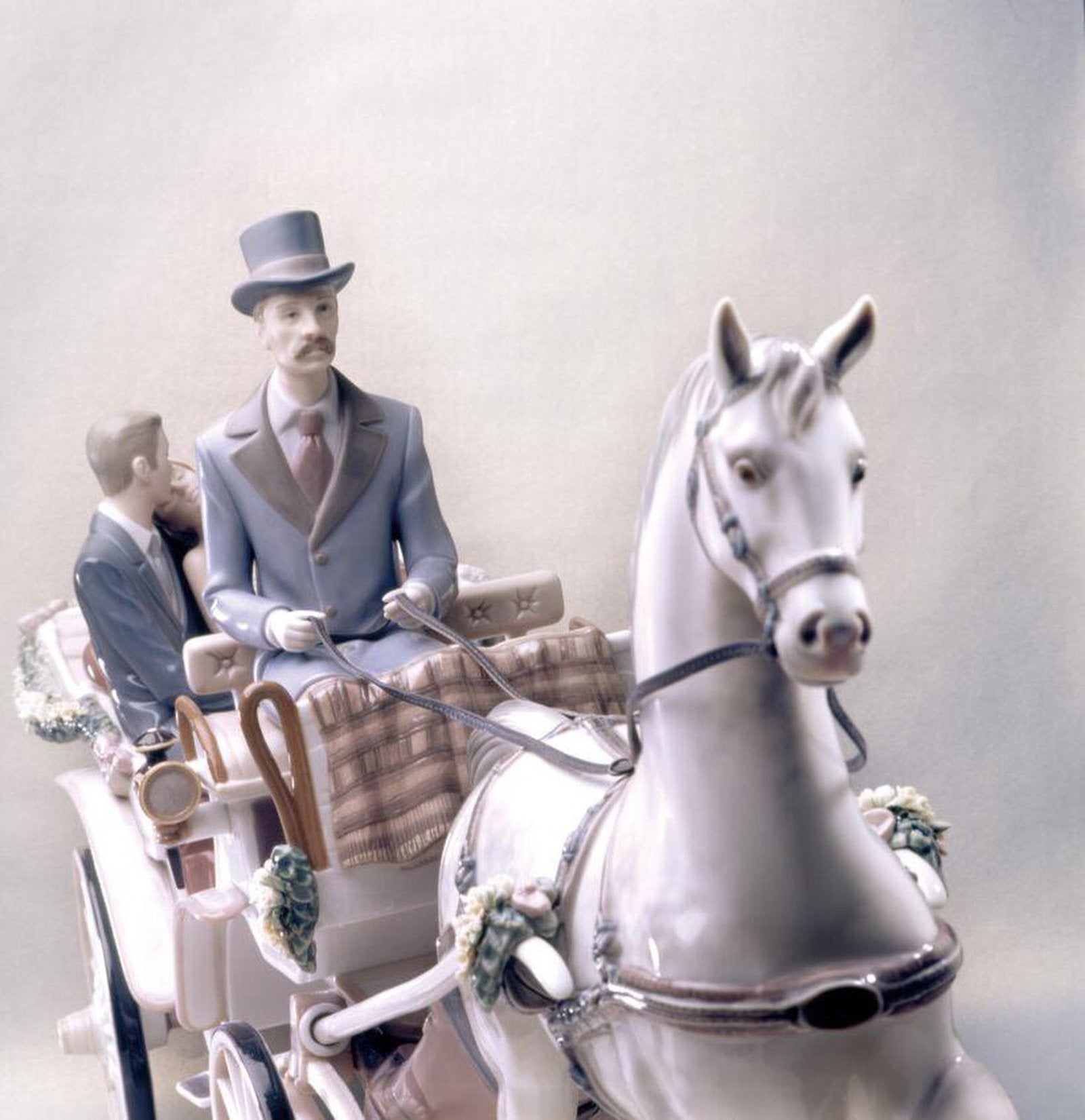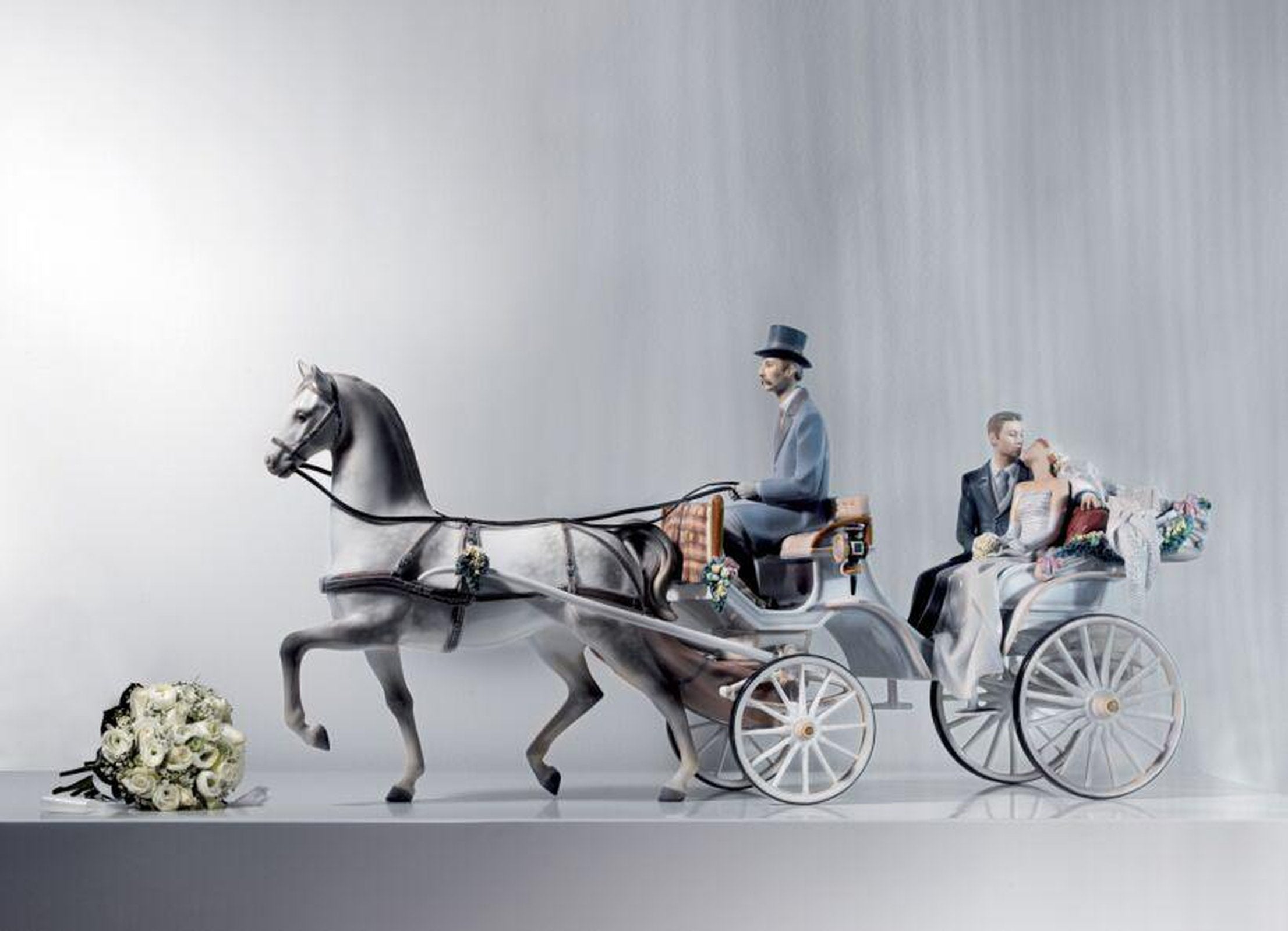 - Limited edition sculpture of a couple with a carriage and handmade flowers in gloss finish porcelain.