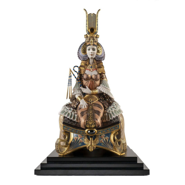 - This exclusive High Porcelain piece, made in matte porcelain, is a limited edition of 500 units. Worth underscoring is the painstaking ornamentation of the whole sculpture, from the clothing to the throne or the staffs she is holding in her hand. Equally of note is the profuse decoration using notes of glazed and matte gold, combined with a mix of coppery and pearly colors and metallic blue and green effects that give the piece a sense of majesty. Here, Cleopatra appears as the great queen she was, enhanced by the neme, the characteristic striped blue and gold headcloth worn by the pharaohs. This magnificent matte porcelain work exemplifies the mastery and know-how of Lladró artists