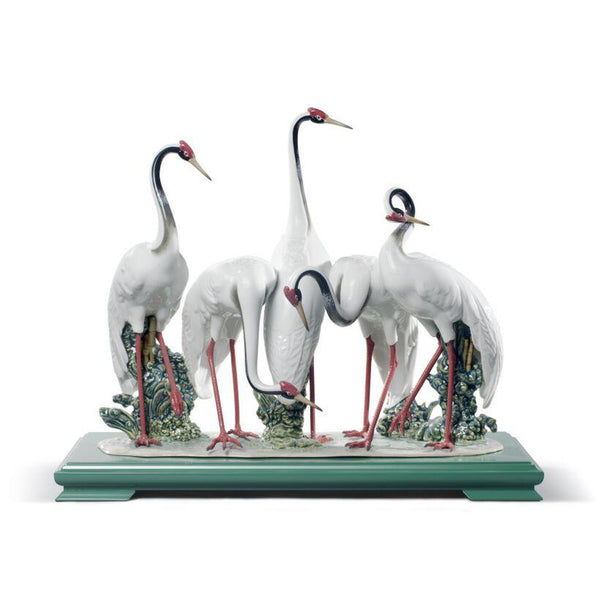 - Glossy porcelain animal sculpture of five limited series red head cranes attached to a green stand.