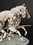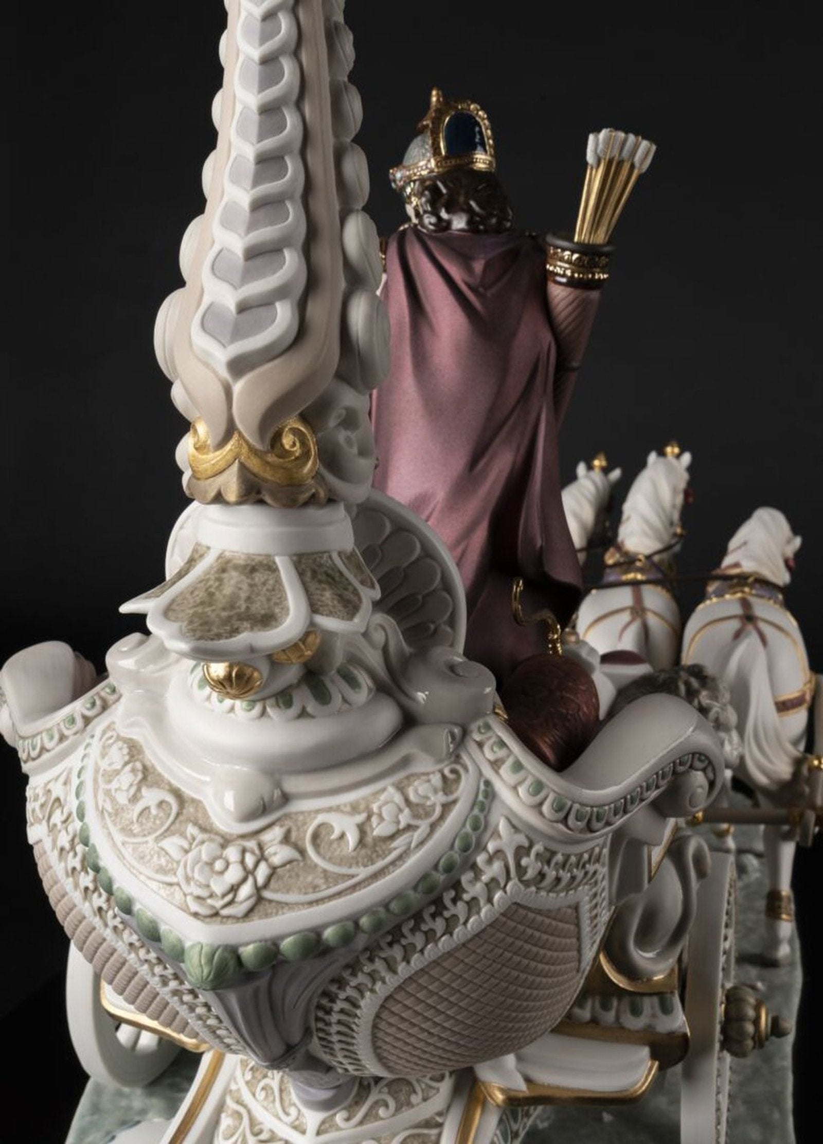 - Made in matte and glazed porcelain, it is decorated with lots of details in golden luster and metallic treatments in the clothing, the chariot and the horses.