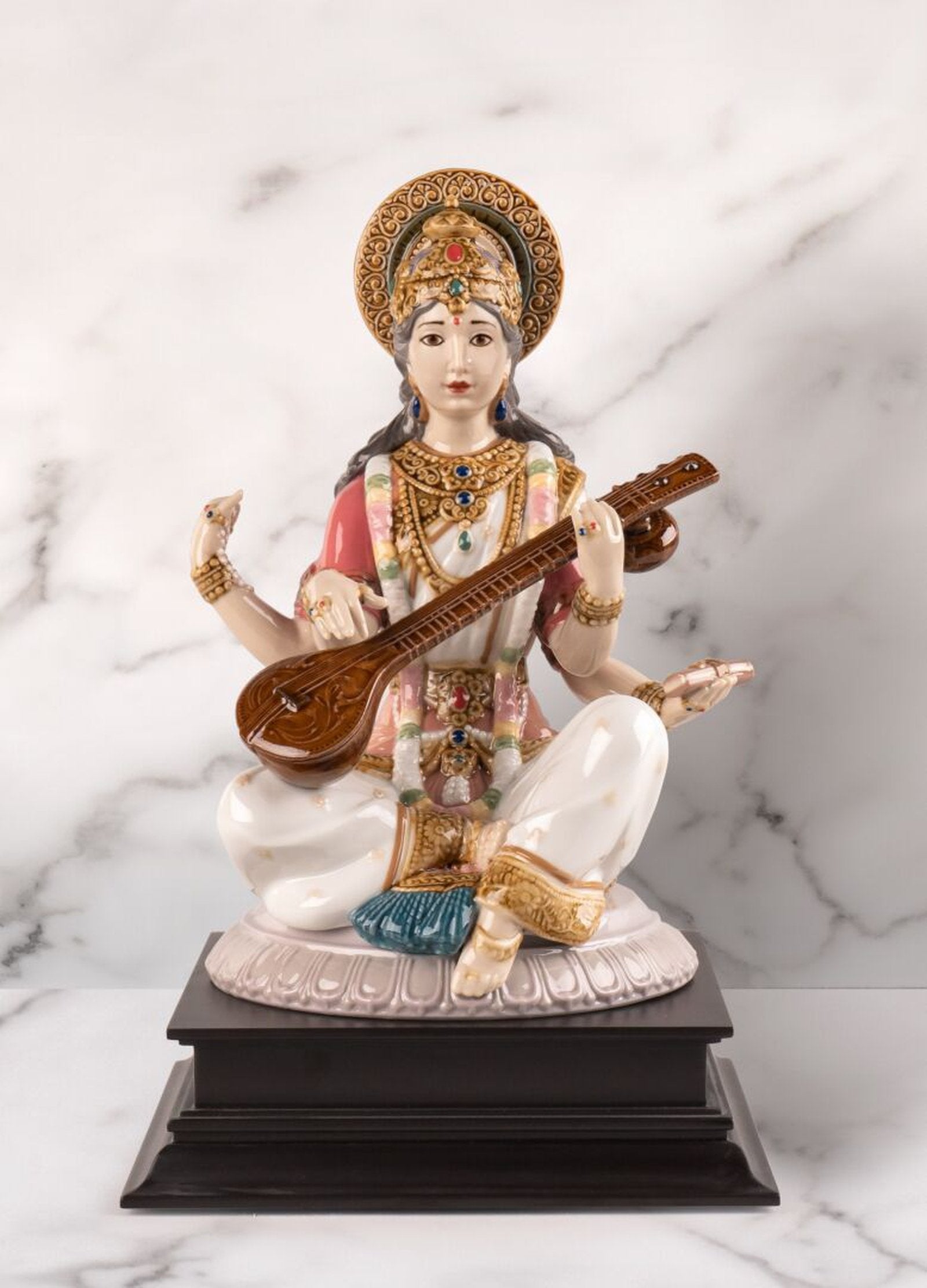- "Saraswati symbolizes learning, truth, education, culture and the arts. She tells us that knowledge is the path towards freedom. This message is further reinforced by her iconography. The four arms represent the states of the mind, while the objects she is carrying in her hands—the necklace of beads, the book and the instrument—speak of the power of meditation, learning and music. Dressed in a white sari, a symbol of her purity, she is ornamented in soft red, brown and blue tones. Covered with a subtle layer of varnish, this spectrum of colors lends the piece a sense of serenity and magnetism. The symbolism and the profound spirituality of this goddess are perfectly rendered in this new creation, crafted entirely by hand in the Lladró workshops. "
