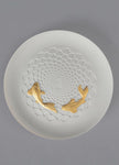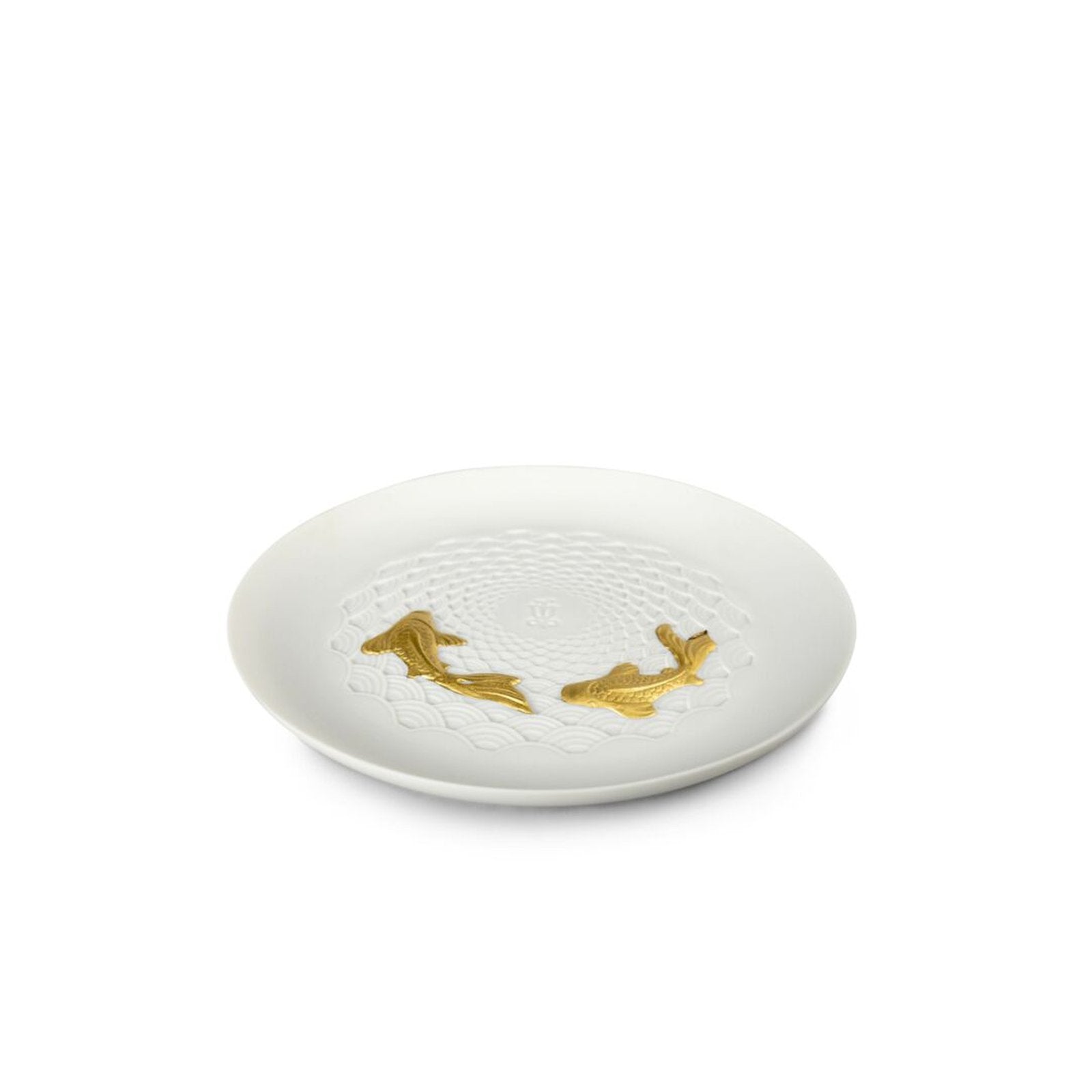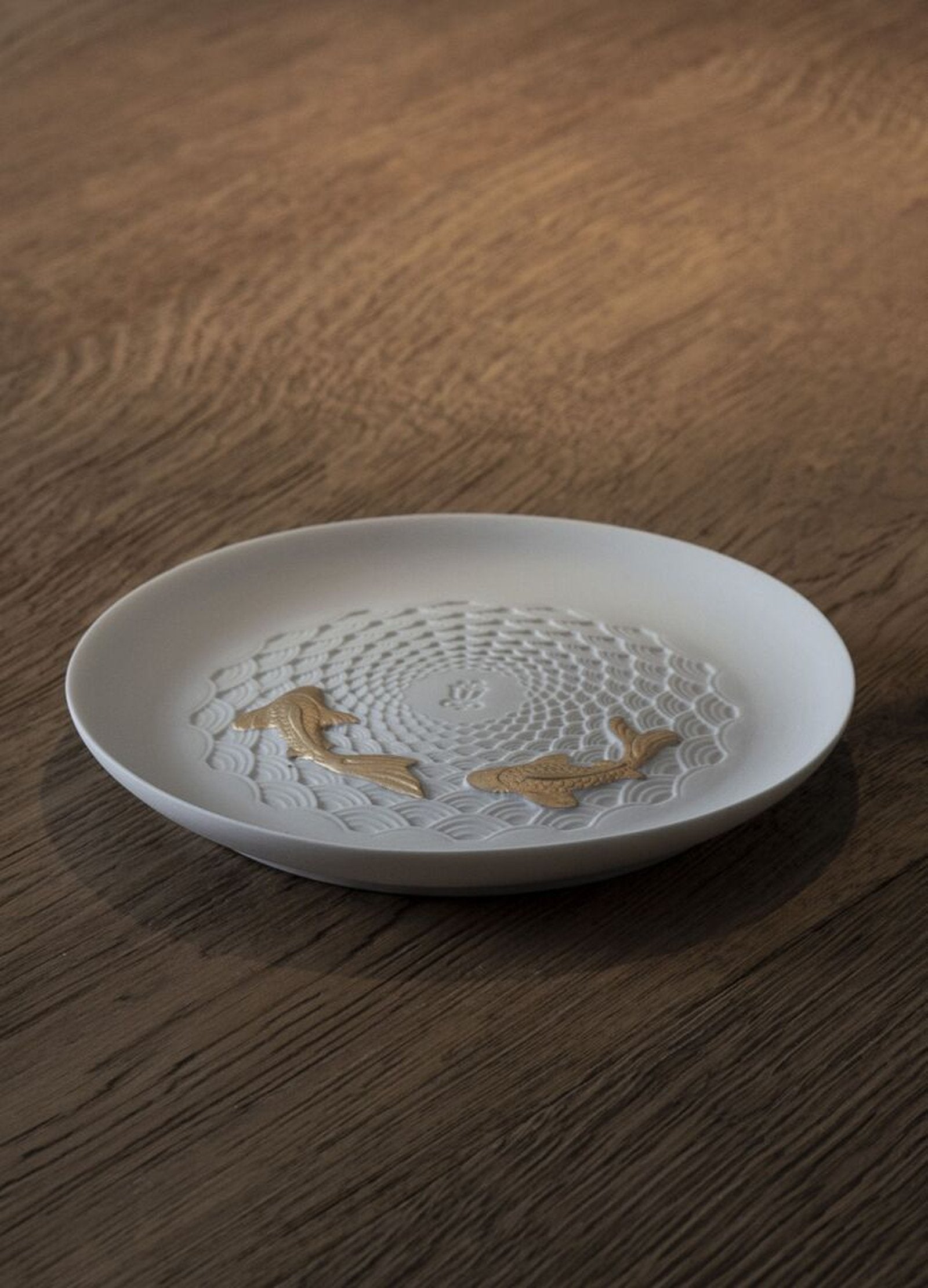 - This elegant plate is made in white matte porcelain while the carps decorating it are highlighted in golden luster. A perfect piece as a wedding favor, for special occasions or as a commemorative gift. Handcrafted in the Lladró workshops in Spain.