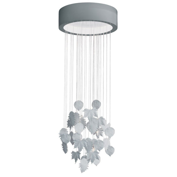 - Ceiling lamp with handmade white porcelain leaves that fall in cascade 0.60 meters on a fiber optic with subtle points of light.