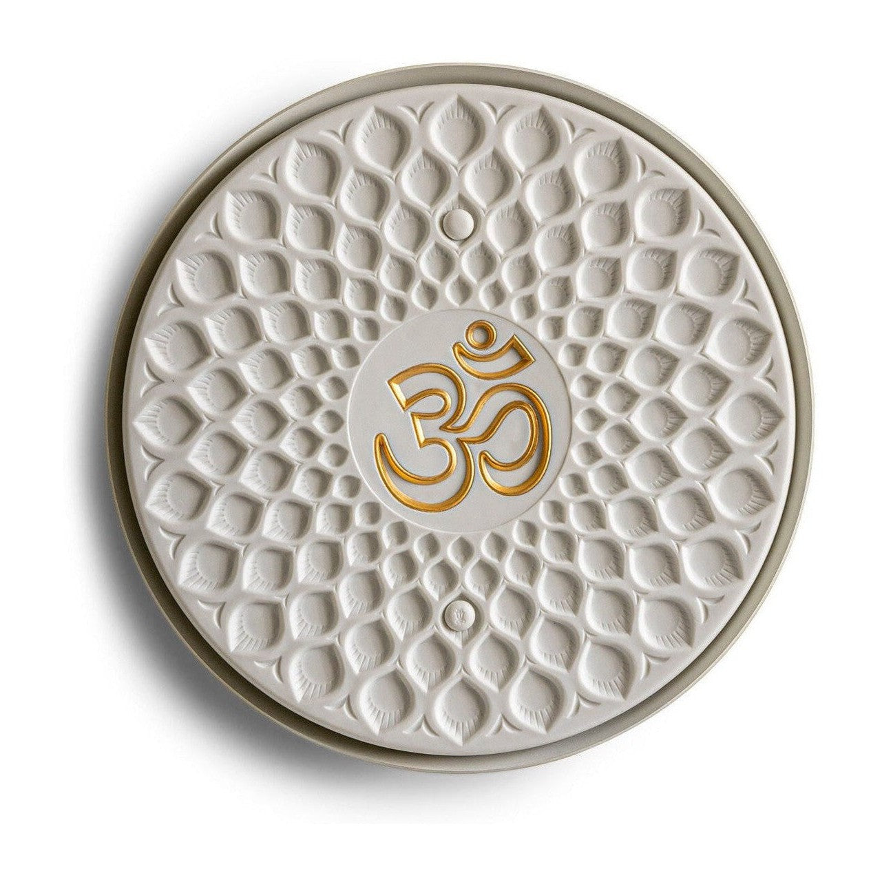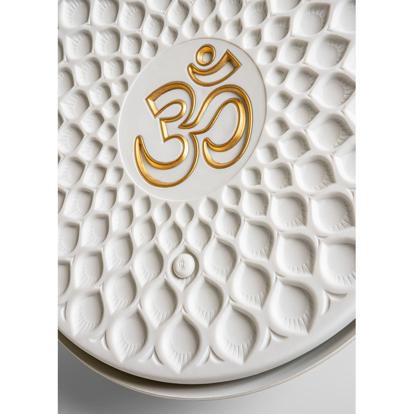- It is made in translucent white matte porcelain on which a detailed geometric ornamentation surrounding the syllable Om has also been etched by hand.