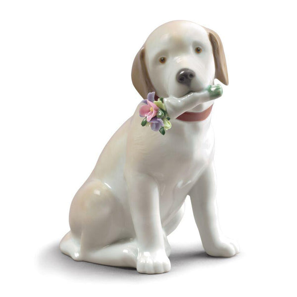 - Glossy porcelain dog figurine with a bouquet in his mouth composed of nine flowers.