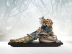 - The colour and decoration of the piece are inspired by the majestic plumage of the peacock, with the implementation of various techniques from enamels in varying shades of green, blue and ochre, to the use of coloured glazes and metallic lustre.