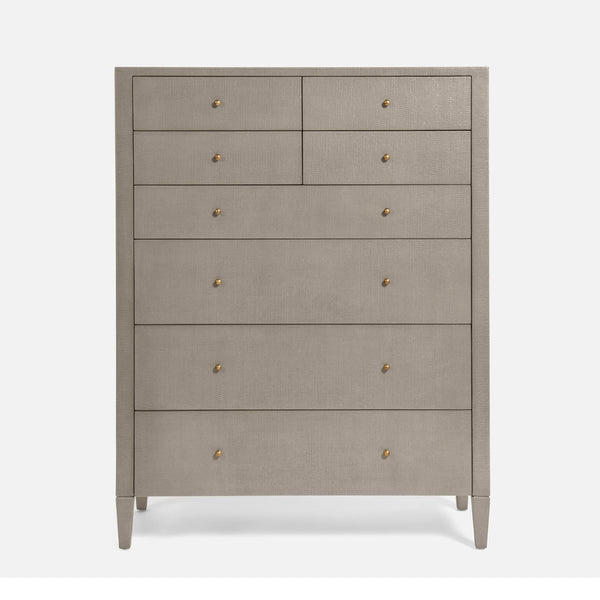 - The new tallboy is covered in glamorous faux raffia and has eight woodlinen drawers offering ample storage.