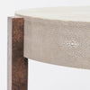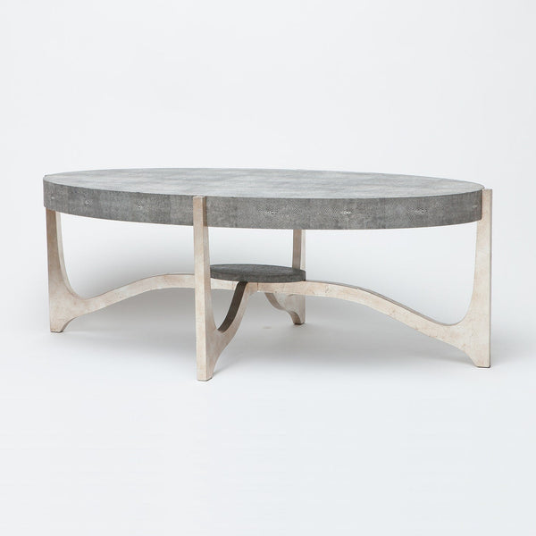 - The sculptural shape of this coffee table is complemented by the oval, faux shagreen top, a detail that is thoughtfully and decoratively repeated on the base.