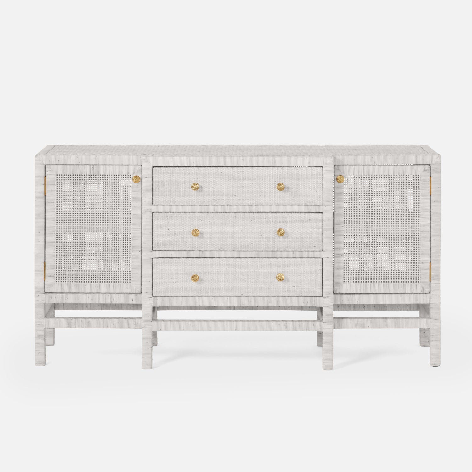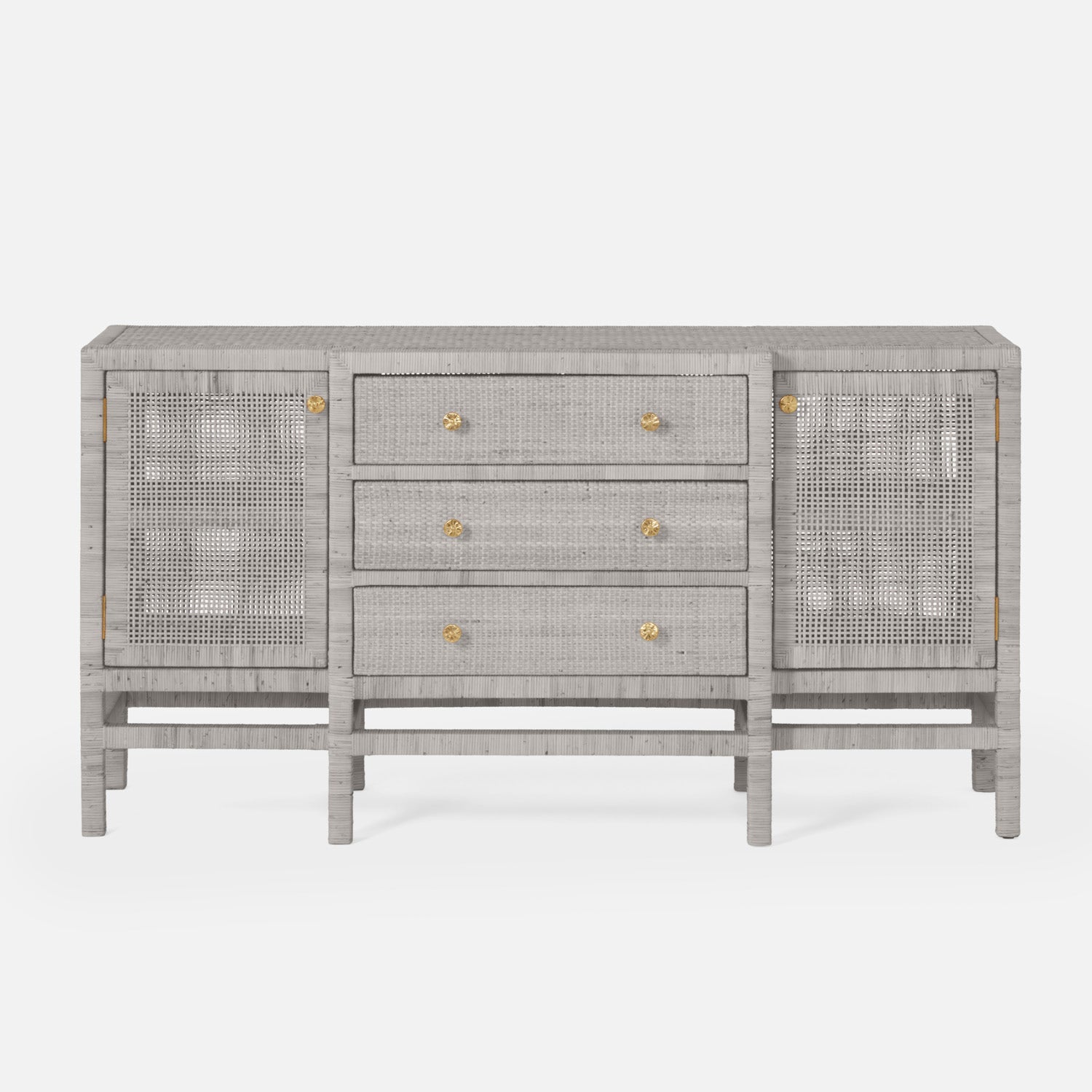 - Our Isla deep buffet offers abundant storage with two loosely woven shelves and three drawers, finished with round sunburst brass knobs.