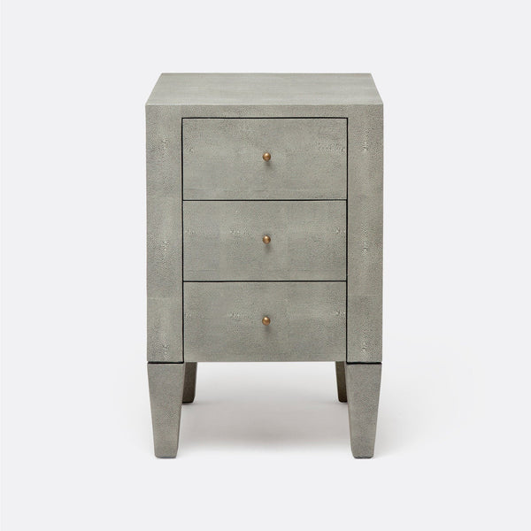 - The piece is fully wrapped in faux shagreen with subtle brass hardware.