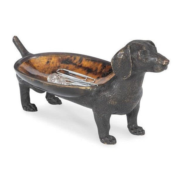 - Cast brass dachshund dish finished in Barcelona Bronze.