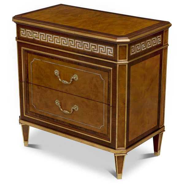 - Myrtle Burl and Gold Gilt night stand with Greek Key Shell Inlay and Brass accents.