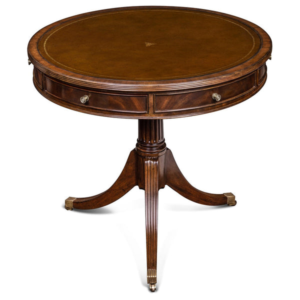 - Crotch Mahogany occasional table with Antique Brown Leather and Brass accents.