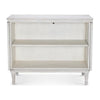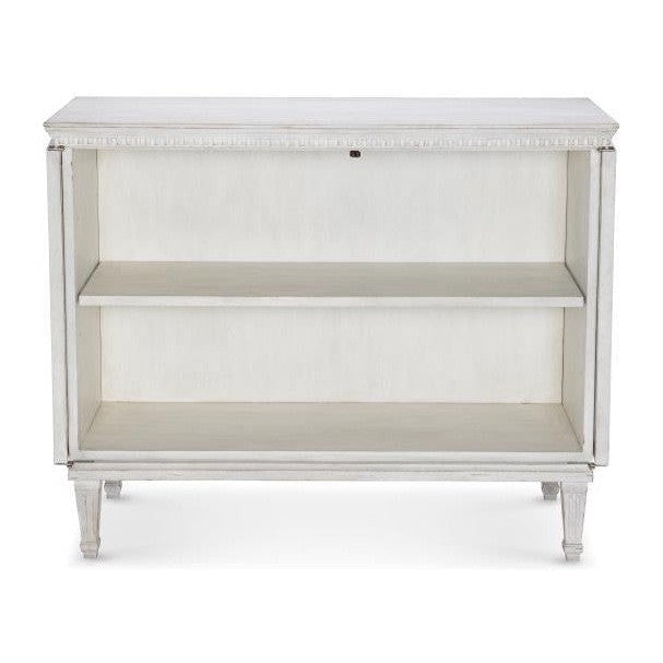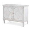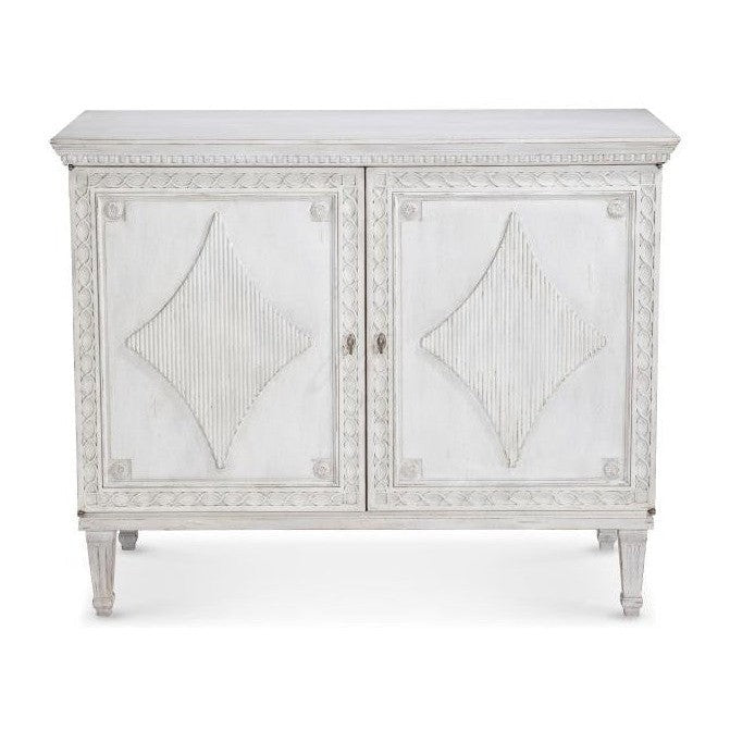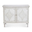 - Antiqued White door chest crafted from solid mahogany, featuring a distressed painted finish and hand carved details.
