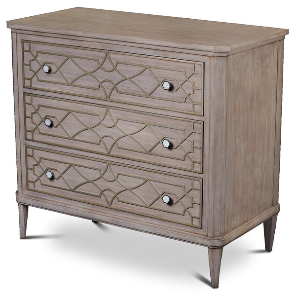 - Weathered grey chest of three Fretwork drawers with Mother of Pearl inlaid hexagonal Brass knobs.