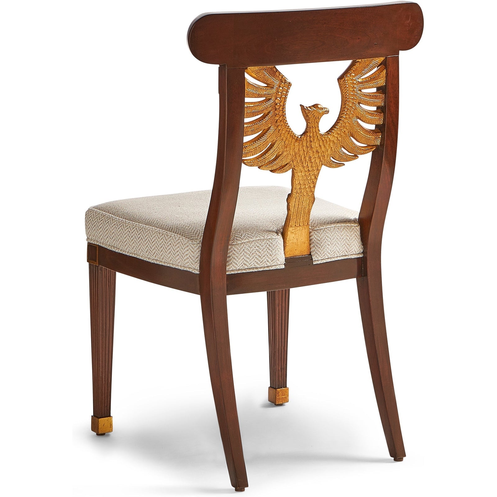 - Mahogany dining chair with hand carved phoenix back, featuring gold leaf accents.