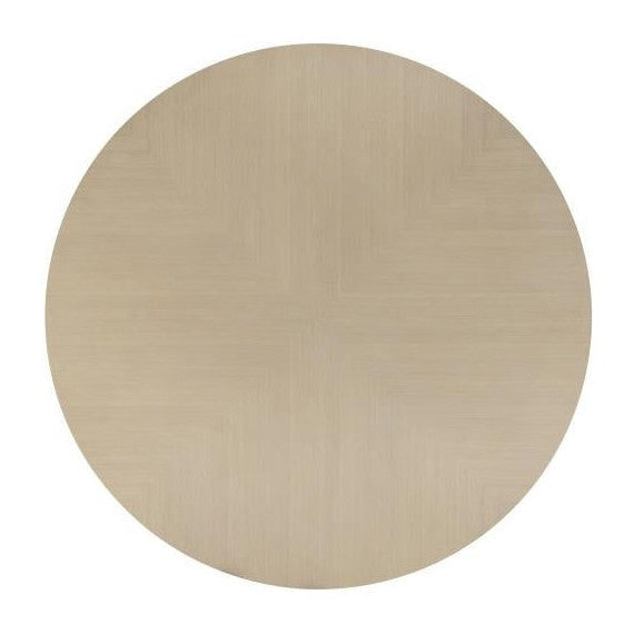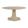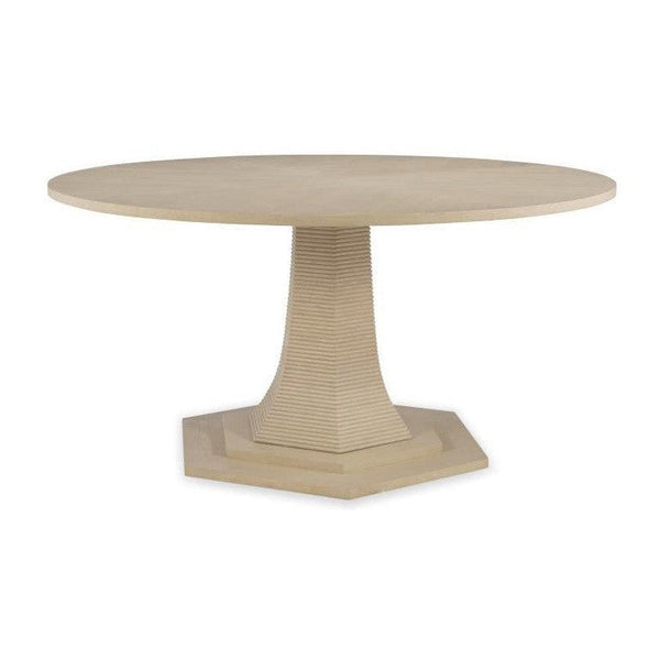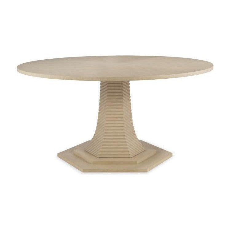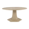 - Lightly cerused oak dining or center table with an octagonal rattan-inspired base.