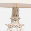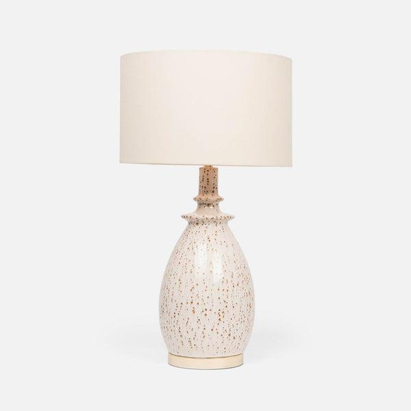 - Handmade pottery lamp in white-and-brown drip with brass details.