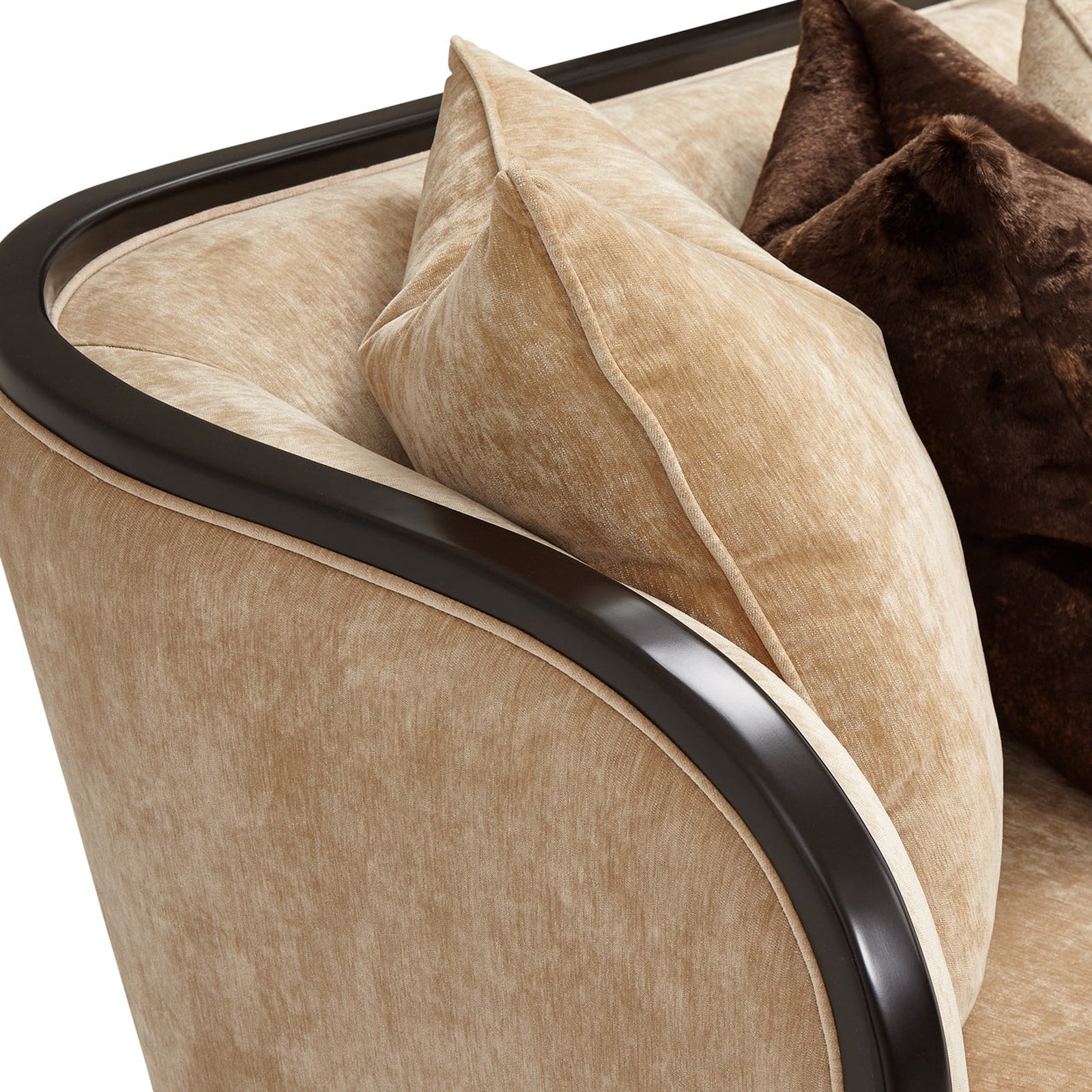 - Wood Construction: Exposed show wood on the front and top of arms and top back rail