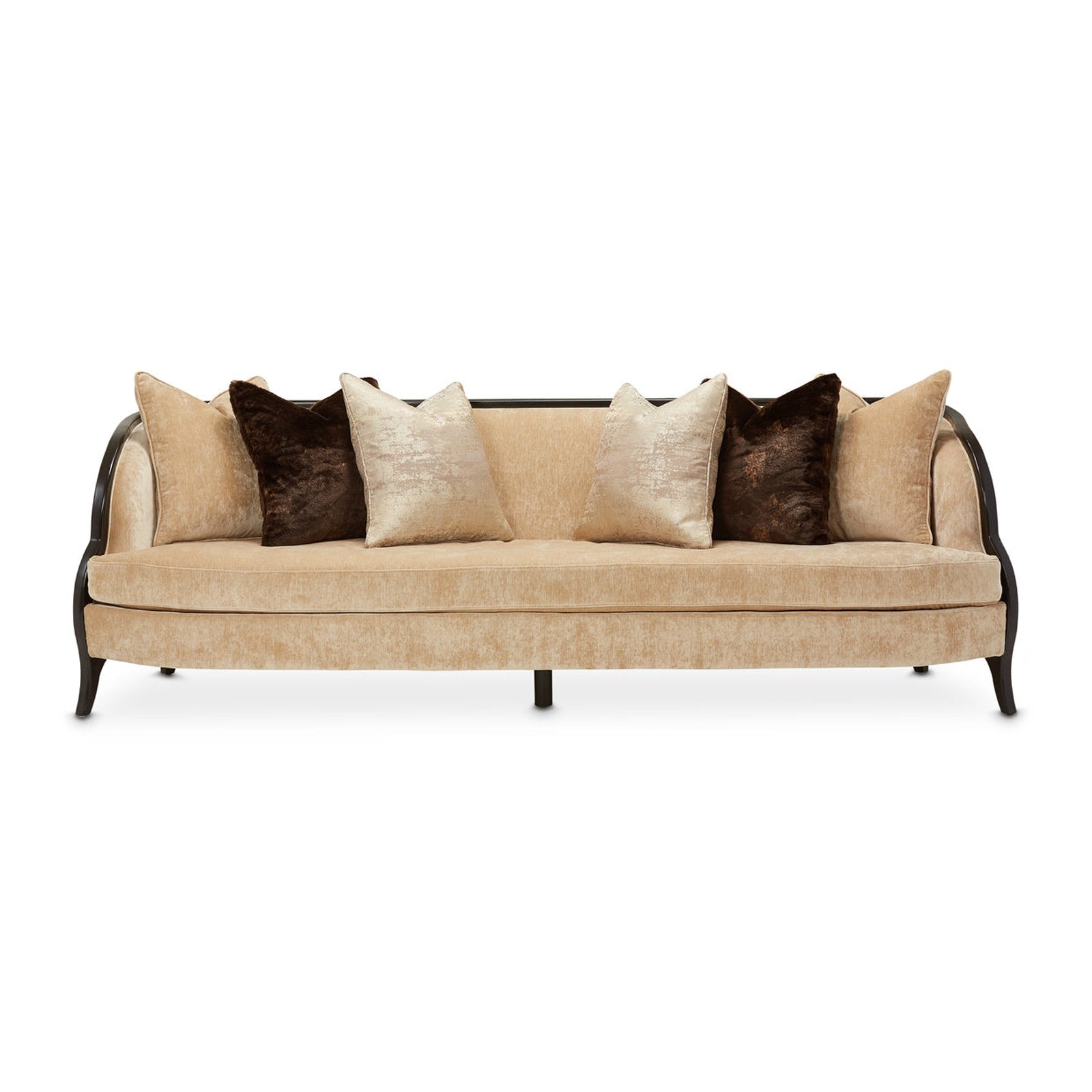 The Malibu Crest Sofa is the perfect centerpiece for your romantic living room. With its graceful curves and cascading arms finished in Dark Espresso, it adds a touch of elegance and sophistication to your space. The plush cushions are upholstered in a soft, textured fabric, making it comfortable for you and your loved ones to relax on. This sofa is not just beautiful but also functional, with ample seating space for you and your guests. You can also accessorize it with decorative throw pillows to create a more personalized look. Overall, the Malibu Crest Sofa is a statement piece that will set the tone for your entire living room. Its timeless design and luxurious finish will make you fall in love with your home all over again.