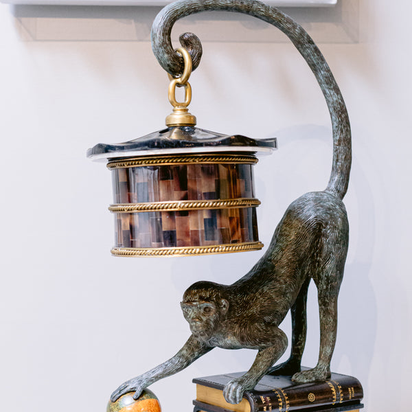 Verdigris Bronze Patina Monkey Lamp, Leather Inlaid Book Design, Young and Black Penshell Shade with Mother of Pearl and Brass Accents