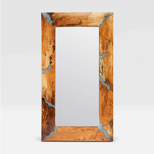- Pieces of beautifully textured tamarind wood with a high-contrast grain are individually pieced together, held by rivers of resin filled with glittering pieces of crushed ice blue glass.