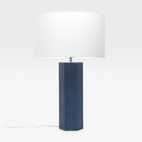- Faux shagreen is used on the hexagonal Poston lamp base.