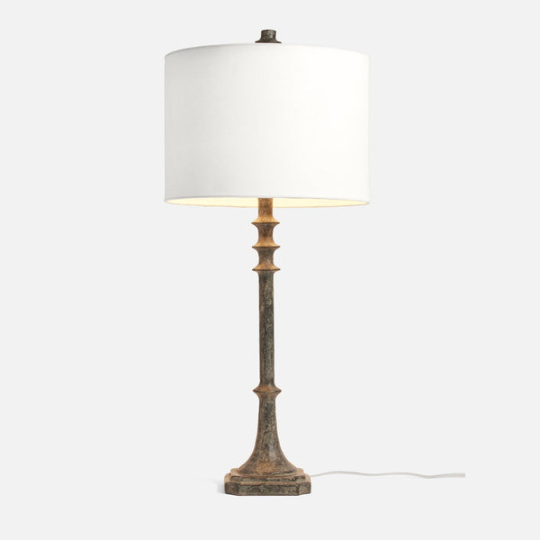 - This spindle lamp, made from matte white resin, conveys the chalky texture and imperfect lines of plaster castings.
