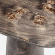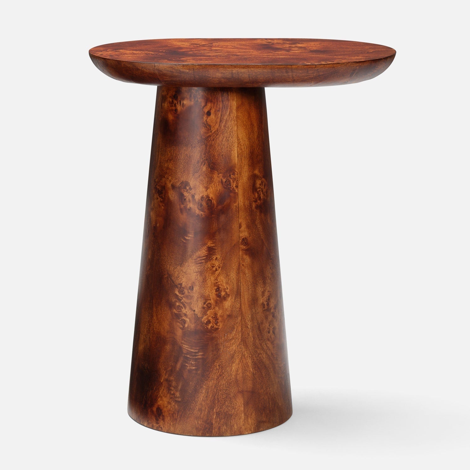 - This mappa burl accent table catches the eye with swirling grain patterns and a leg tapered with an oblong-shaped top.