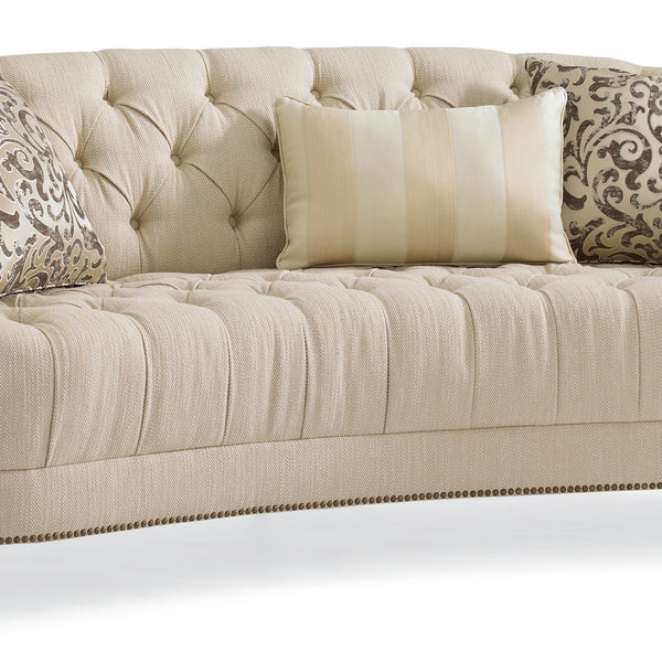 - Curvaceous and shapely, with traditional elements like button-tufting and decorative nailhead trim, this tight bench seat sofa also conveys a modern sensibility covered in fabric, with metallic accents on the pillows.