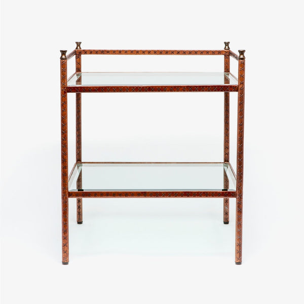 - The Silas tobacco leather-wrapped metal frame brings warmth to this side table featuring glass shelves, bold stitching, and brass details.