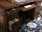 - Traditional designs in Cherry with faux leather writing surface and nine full extension drawers.