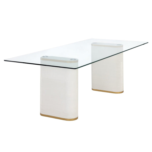 - Features a rectangular clear glass tabletop that sits on two white concrete legs.
