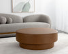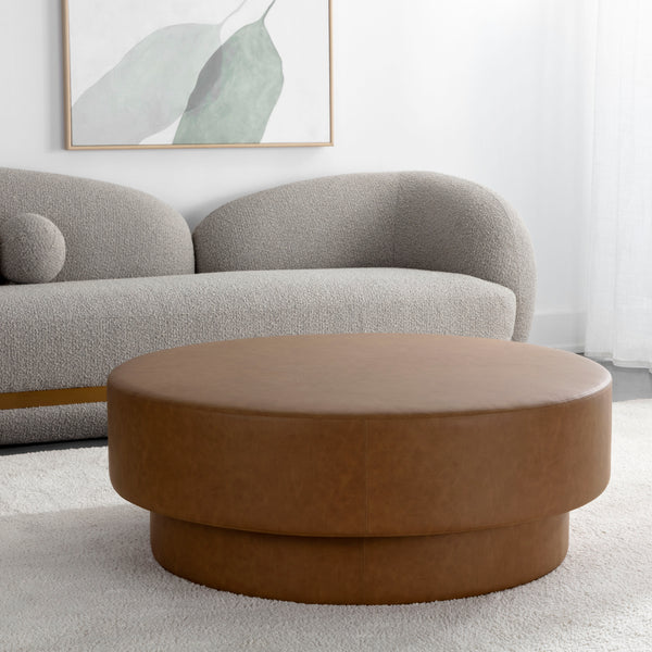 Clean contours and smooth faux leather upholstery lend a sophisticated air to the Arlo Ottoman. Its multifunctional design, characterized by its grand round shape, allows for endless possibilities.