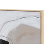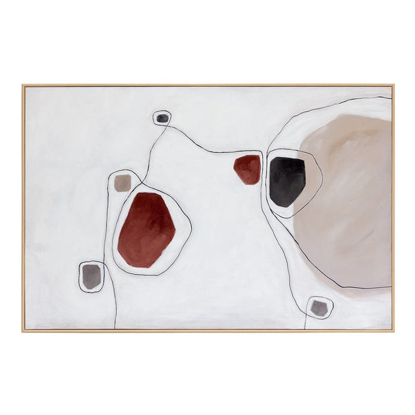 - A modern art piece that features thin free flowing lines encompassing muted forms in a terracotta colour palette.
