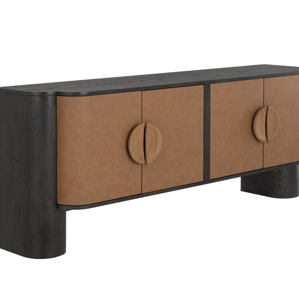 Mid-century flair and expert craftsmanship give the Dresden Sideboard a handsome form. Constructed from smoke grey oak veneer with milliken cognac faux leather on the doors for an intriguing look. Textured circular handles in solid oak wood add a global flair.